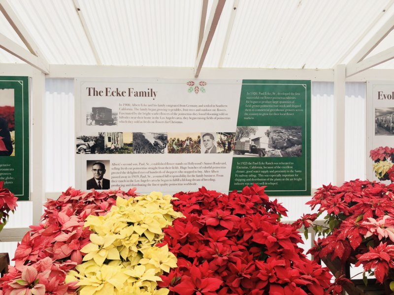 • Get in the Christmas spirit early each year as you walk into the Pointsettia Display. The display is host to over 20 species of this iconic plant. Large signs cover the walls giving historic information about the plants themselves as well as information about how they were originally introduced into The Flower Fields of Carlsbad.